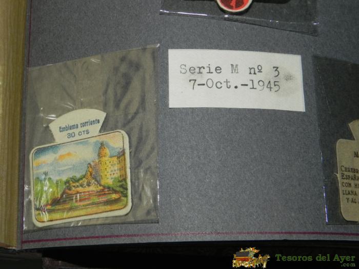 EMBLEMA DE AUXILIO SOCIAL, PRECIO 30 CTS, TAMAÑO 3 X 3,5 CMS, SERIE M, NUMERO 3, 7 OCTUBRE DE 1945