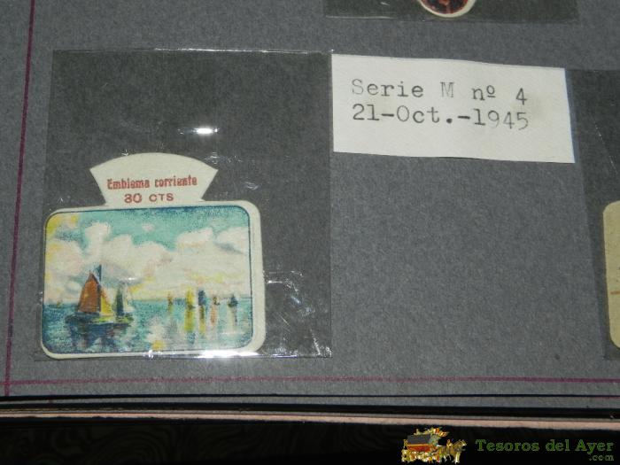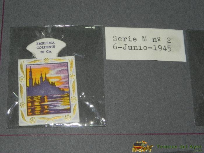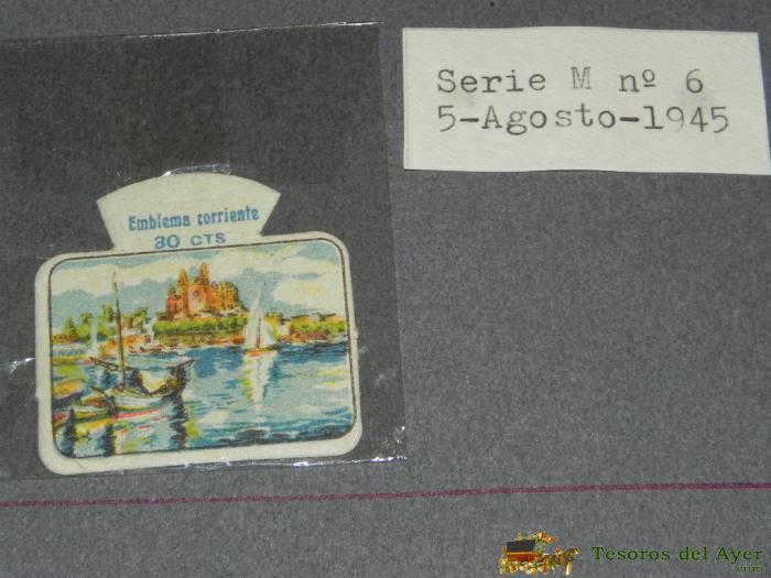EMBLEMA DE AUXILIO SOCIAL, PRECIO 30 CTS, TAMAÑO 3 X 3,5 CMS, SERIE M, NUMERO 6, 5 AGOSTO DE 1945