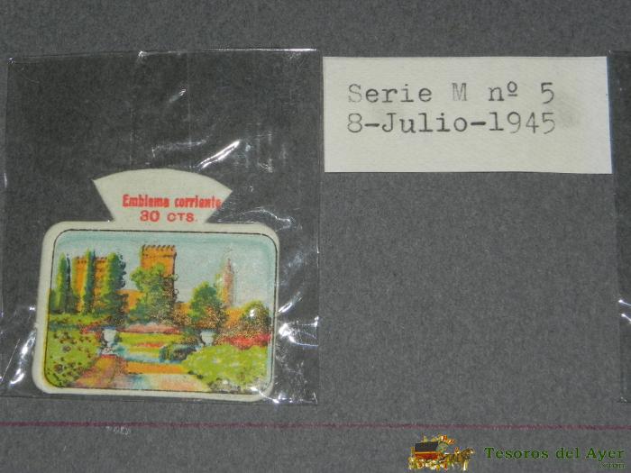 EMBLEMA DE AUXILIO SOCIAL, PRECIO 30 CTS, TAMAÑO 3 X 3,5 CMS, SERIE M, NUMERO 5, 8 JULIO DE 1945