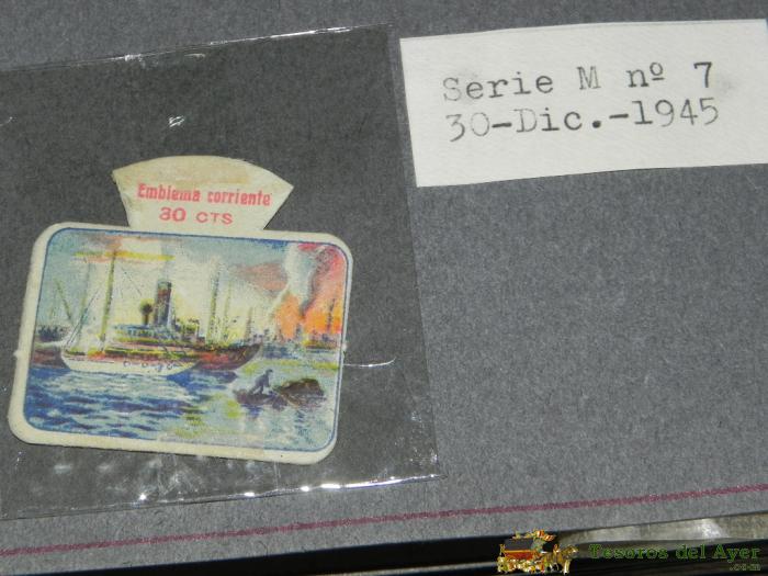 EMBLEMA DE AUXILIO SOCIAL, PRECIO 30 CTS, TAMAÑO 3 X 3,5 CMS, SERIE M, NUMERO 7, 30 DICIEMBRE DE 1945