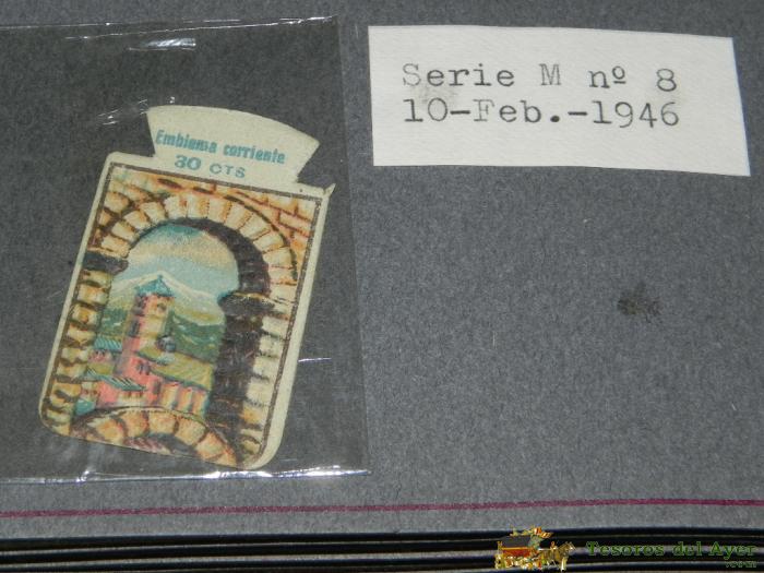 EMBLEMA DE AUXILIO SOCIAL, PRECIO 30 CTS, TAMAÑO 3 X 3,5 CMS, SERIE M, NUMERO 8, 10 FEBRERO DE 1946
