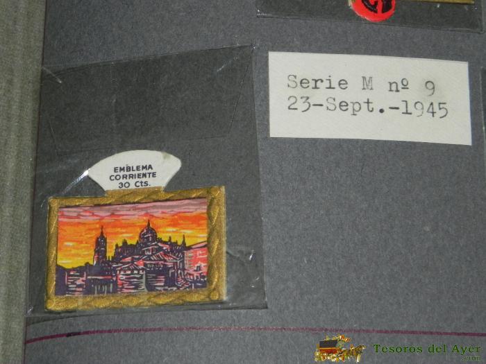 EMBLEMA DE AUXILIO SOCIAL, PRECIO 30 CTS, TAMAÑO 3 X 3,5 CMS, SERIE M, NUMERO 9, 23 SEPTIEMBRE DE 1945