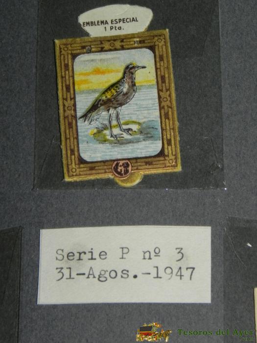 EMBLEMA DE AUXILIO SOCIAL, PRECIO 1 PESETA, TAMAÑO 3 X 4,5 CMS, SERIE P, NUMERO 3, 31 AGOSTO DE 1947, ESPECIAL