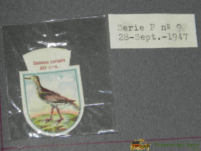 EMBLEMA DE AUXILIO SOCIAL, PRECIO 30 CTS, TAMAÑO 2 X 4 CMS, SERIE P, NUMERO 9, 28 SEPTIEMBRE DE 1947