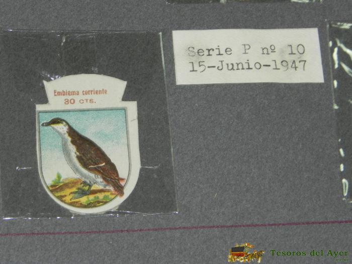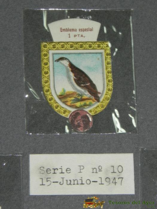 EMBLEMA DE AUXILIO SOCIAL, PRECIO 1 PESETA, TAMAÑO 2,5 X 4,5 CMS, SERIE P, NUMERO 10, 15 JUNIO DE 1947, ESPECIAL