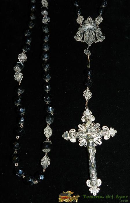 ANTIGUO ROSARIO ESPECTACULAR EN AZABACHE Y FILIGRANA DE PLATA. FINALES SIGLO XIX. LARGO 66 CMS