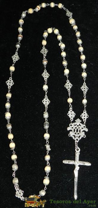 ANTIGUO ROSARIO DE PLATA Y MADERA, MIDE 56 CMS. DE LONGITUD INCLUIDO EL CRUCIFIJO, SIGLO XIX. EXCELENTE ESTADO. PRECIOSO