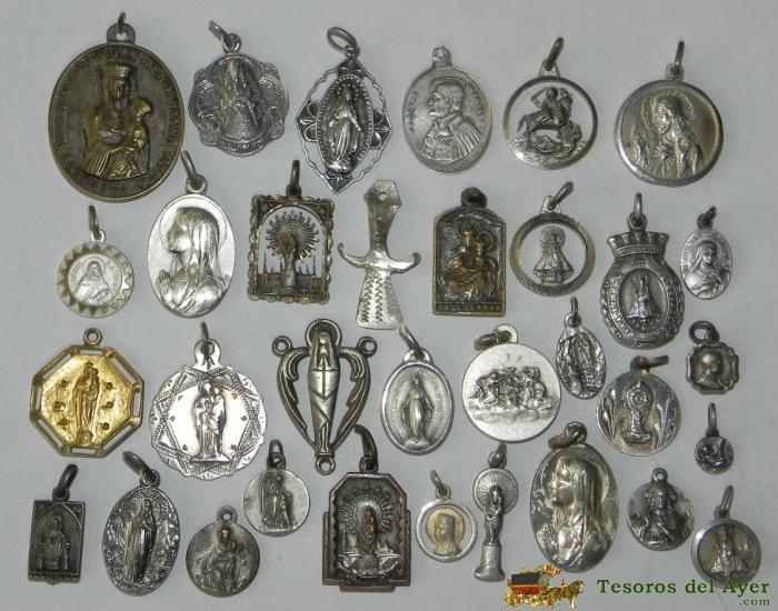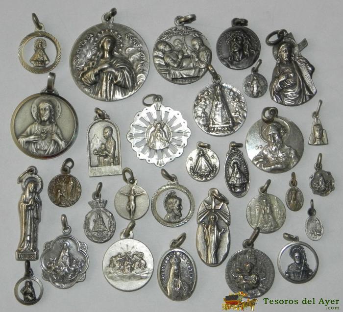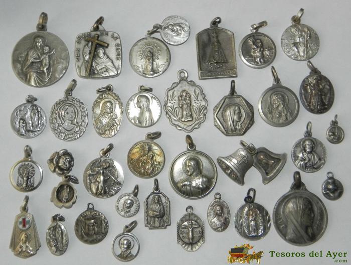 ANTIGUO LOTE DE 34 MEDALLAS RELIGIOSAS ALGUNAS DE PLATA, TAL COMO SE VE EN LA FOTOGRAFIA PUESTA. EXCELENTE.