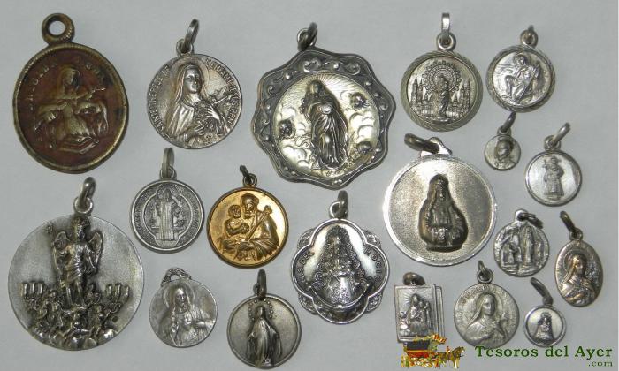 ANTIGUO LOTE DE 19 MEDALLAS RELIGIOSAS ALGUNAS DE PLATA, TAL COMO SE VE EN LA FOTOGRAFIA PUESTA. EXCELENTE.