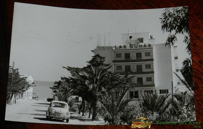 ANTIGUA FOTO POSTAL DE GUARDAMAR DEL SEGURA, ALICANTE, HOTEL LAS DUNAS, COCHE SEAT 600, FOTO PALLARES, CIRCULADA.