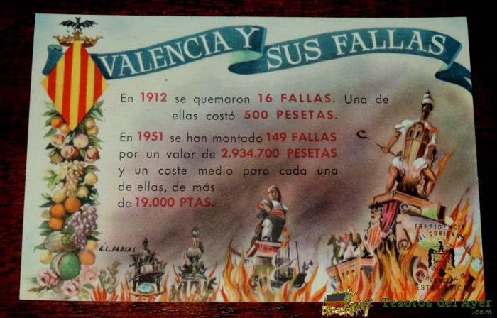 POSTAL DE VALENCIA Y SUS FALLAS, ILUSTRADA POR A.L. PADIAL, ED. POR PRESIDENCIA DEL GOBIERNO, INSTITUTO DE ESTADISTICA, I.G. VALVERDE, NO CIRCULADA.