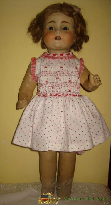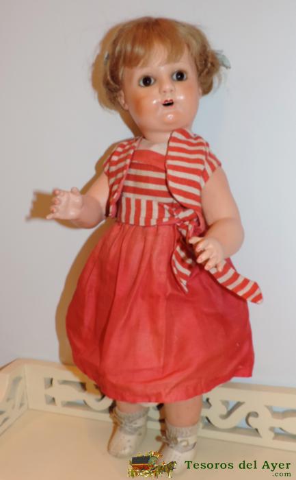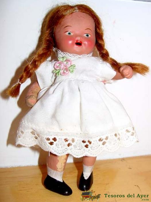 ANTIGUA MUñECA AñOS 30. MARCAS EN LA NUCA T B REALIZADA EN COMPOSICIóN. POR SUS CARACTERISTICAS PUEDE SER CATALANA. CABELLO DE MOHAIR EN BUEN ESTADO CON BONITO PEINADO RECOGIDO EN RODETES, OJO FIJO DE CRISTAL COLOR MIEL, VISTE UN CONJUNTO FORMADO POR VE