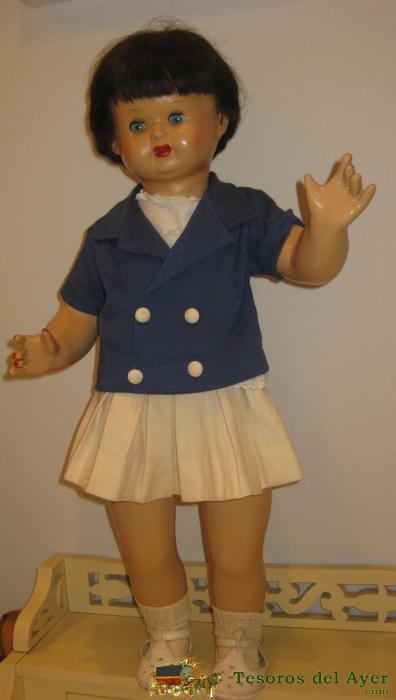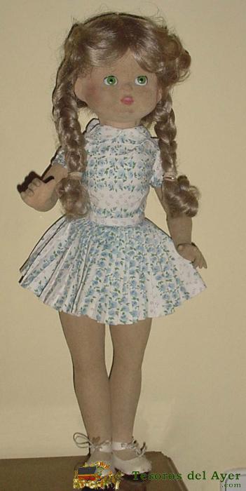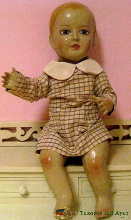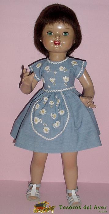 MAGNÍFICA MUÑECA PATRICIA DE LA CASA FLORIDO, ESPAÑA AÑOS 50, REALIZADA EN CARTÓN PIEDRA PINTADA AL DUCO-CABELLO NATURAL-OJO DURMIENTE COLOR VERDE -CINTURA ARTICULADA-ROPA DE ORIGEN- MIDE 48 CM