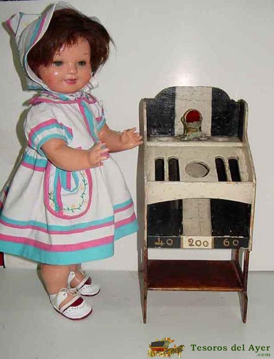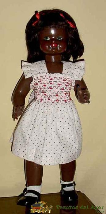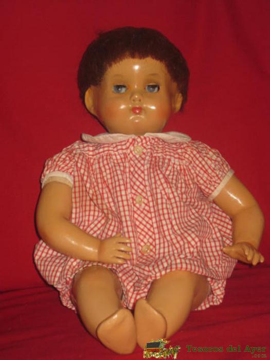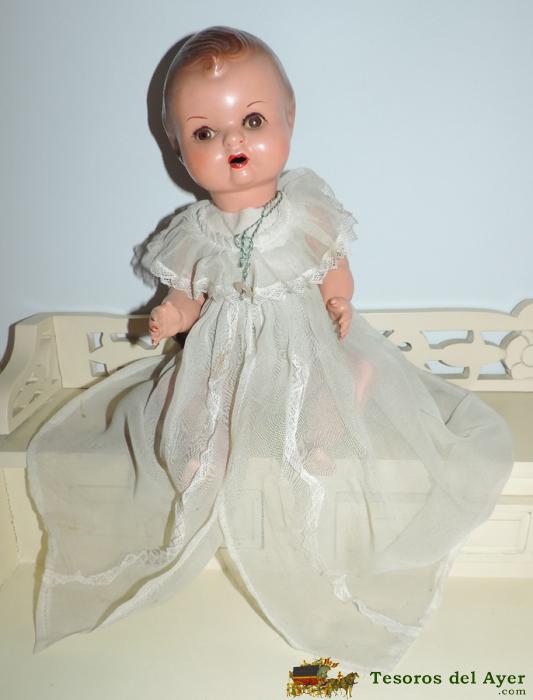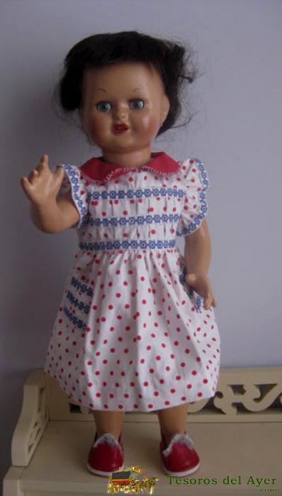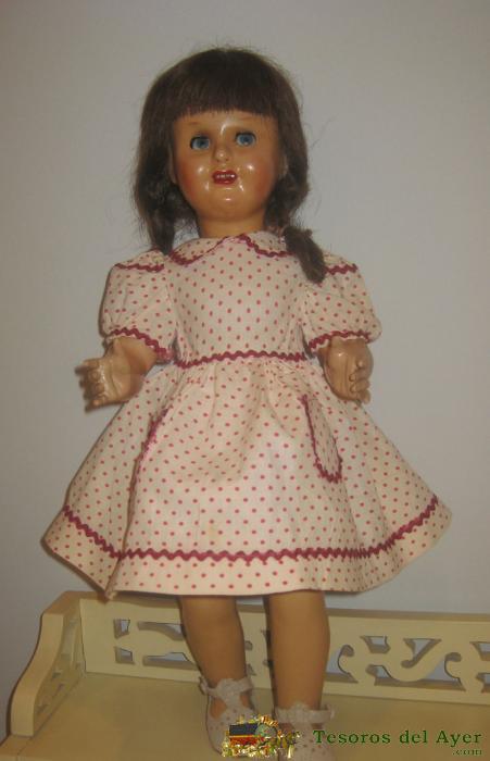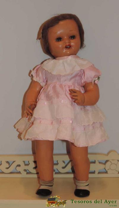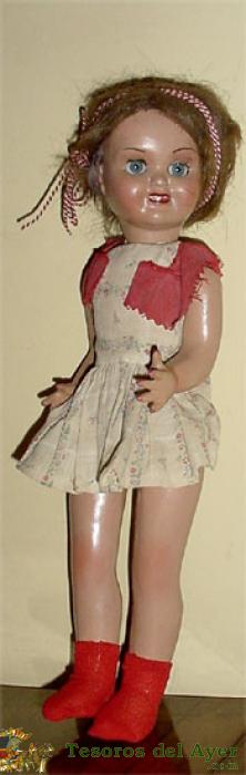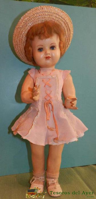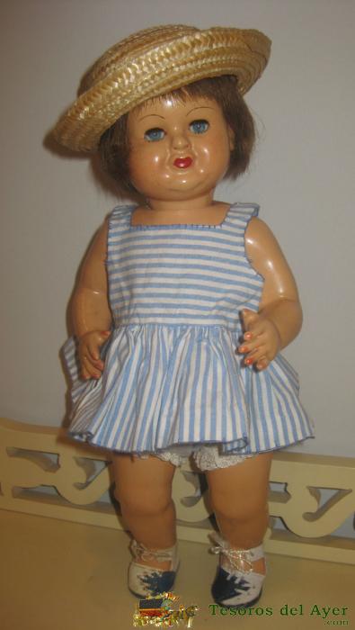 ANTIGUA MUÑECA AÑOS 50 DE SANTIAGO MOLINA,ONIL ALICANTE, DENOMINADA EN CATÁLOGO COMO MUÑECA CORRIENTE, CABEZA DE CELULOIDE SOBRE CUERPO DE CARTÓN PIEDRA, CABELLO NATURAL,OJO DURMIENTE, ROPA DE ORIGEN