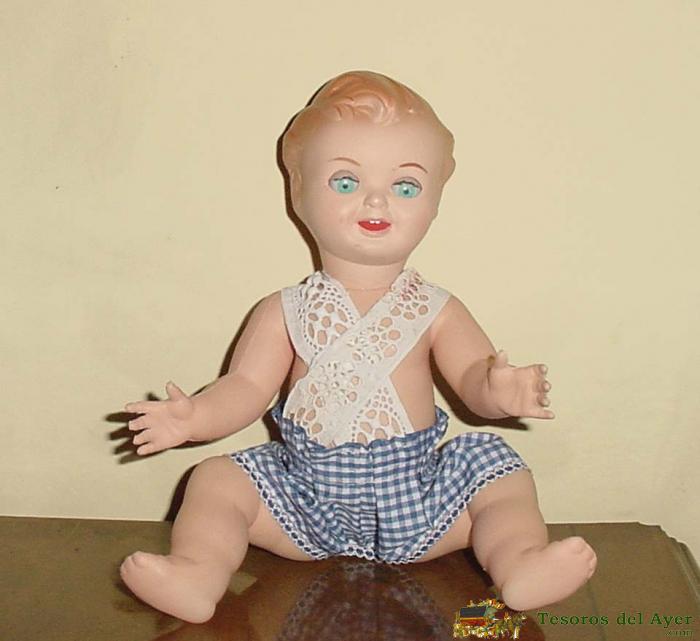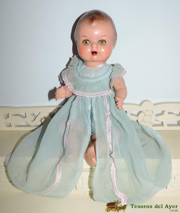 BEBE PEPIN DE SANTIAGO MOLINA FINALES DE LOS 50. CABEZA DE CELULOIDE CUERPO DE PLASTICO. PELO DECOERADO Y MOLDEADO, OJO DURMIENTE, BOCA ABIERTA QUE PERMITE VERDLOS DIENTES SUPERIORES. LA ROPA NO ES ORIGINAL. MIDE 30CMS.