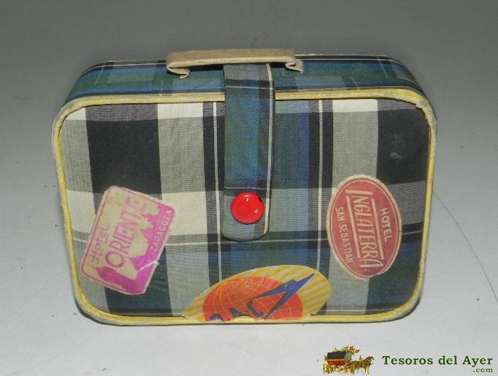 ANTIGUA MALETA CON ETIQUETAS DE HOTELES, MUY PROPIA PARA MUÑECAS COMO MARIQUITA PEREZ, GISELA, CAYETANA, LILY, JUANIN, ETC.. DE TELA Y CUERO, AÑOS 40, MIDE 13 X 9 X 5 CMS.