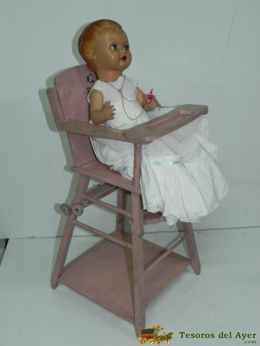 ANTIGUA TRONA Y TACA-TACA EN MADERA, IDEAL PARA MUÑECAS COMO APARECE EN LAS FOTOGRAFIAS PUESTAS, NO SE INCLUYE LA MUÑECA, MIDE 48 X 25 CMS. BUEN ESTADO.