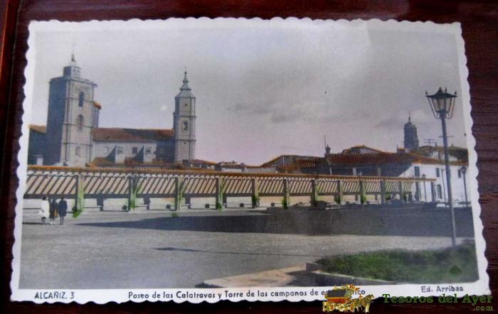 ANTIGUA FOTO POSTAL COLOREADA DE ALCAÑIZ (TERUEL) . PASO DE LAS CALATRAVAS Y TORRE DE LAS CAMPANAS DE ESTILO GOTICO, ED. ARRIBAS - SIN CIRCULAR