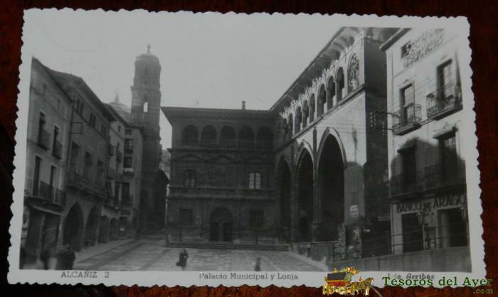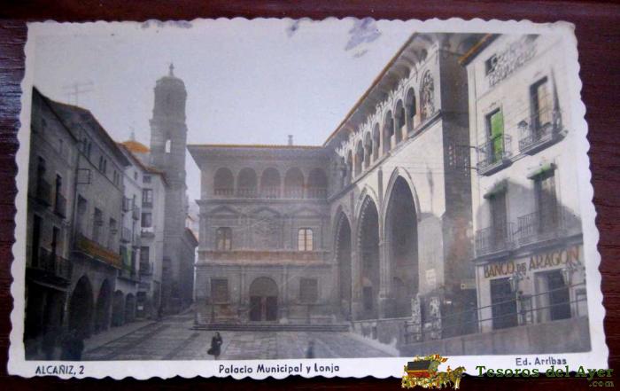 ANTIGUA FOTO POSTAL COLOREADA DE ALCAÑIZ (TERUEL) . PALACIO MUNICIPAL Y LONJA, ED. ARRIBAS - SIN CIRCULAR