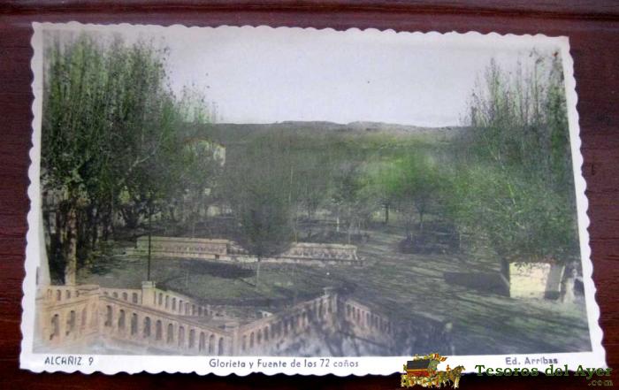 ANTIGUA FOTO POSTAL COLOREADA DE ALCAÑIZ (TERUEL) . GLORIETA Y FUENTE DE LOS 72 CAÑOS, ED. ARRIBAS - SIN CIRCULAR