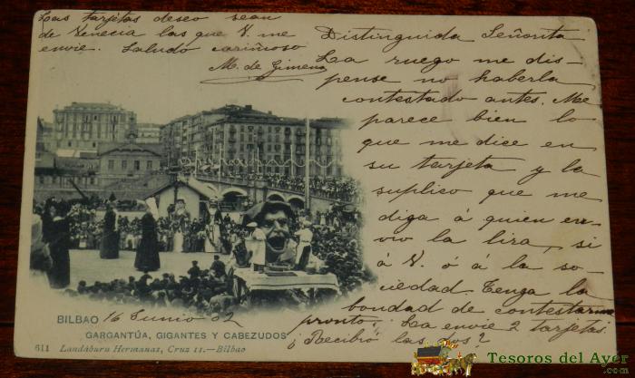 POSTAL BILBAO GARGANTUA GIGANTES Y CABEZUDOS . HAUSER Y MENET 611 . CIRCULADA. REVERSO SIN DIVIDIR.