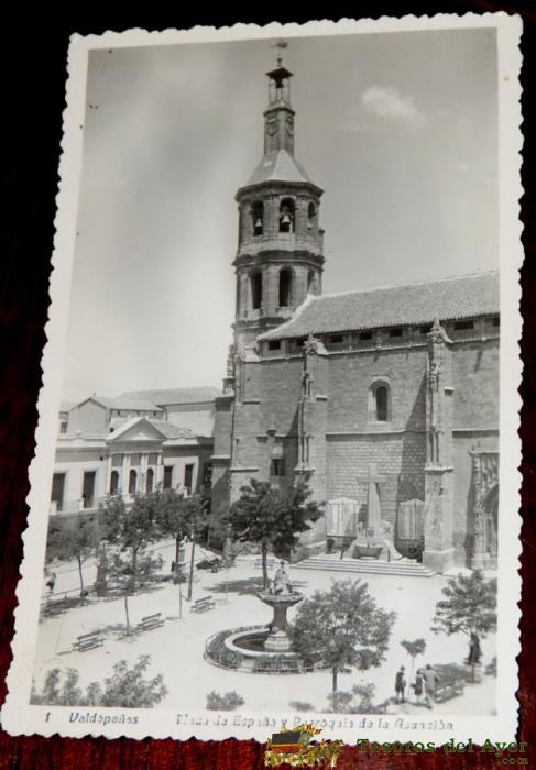 FOTO POSTAL DE VALDEPEÑAS (CIUDAD REAL) - PLAZA DE ESPAÑA Y PARROQUIA DE LA ASUNCION - N. 1 - NO CIRCULADA.