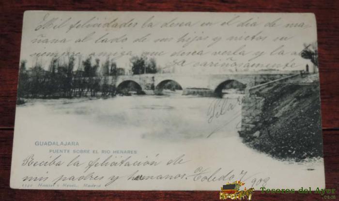 POSTAL DE GUADALAJARA. PUENTE SOBRE EL RíO HENARES. 1342. HAUSER Y MENET. CIRCULADA, SIN DIVIDIR.