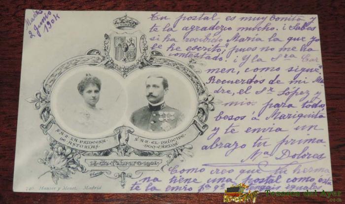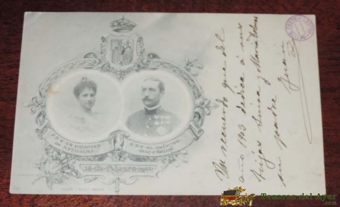 ANTIGUA POSTAL DE SU ALTEZA REAL LA PRINCESA DE ASTURIAS Y S.A.R. EL PRINCIPE DON CARLOS - 14 DE FEBRERO DE 1901 - HAUSER Y MENET, CIRCULADA Y SIN DIVIDIR,