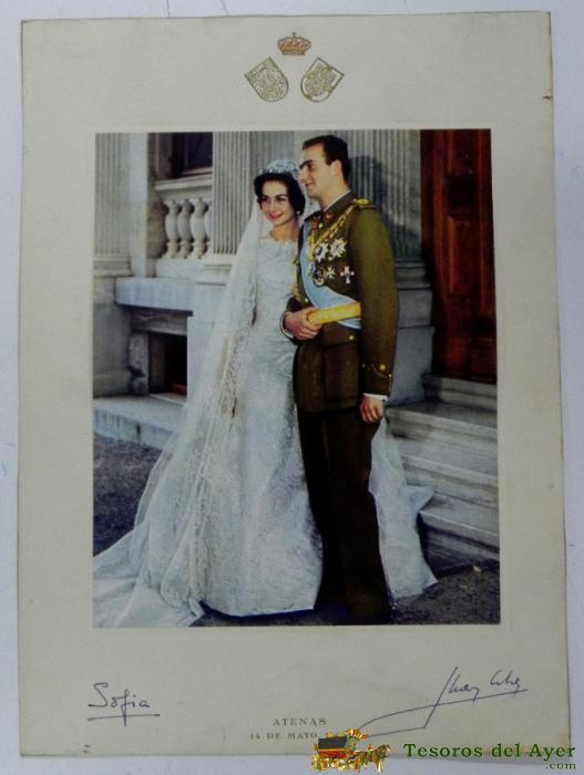 FOTOGRAFIA DE LA BODA DEL REY DON JUAN CARLOS I Y DOÑA SOFIA, CON SUS FIRMAS AUTOGRAFAS, ATENAS 14 DE MAYO DE 1962 - MIDE 24 X 18 CM.