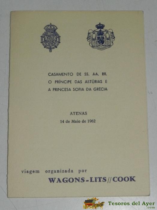 ANTIGUO PROGRAMA DIPTICO DEL VIAJE PARA LA BODA DE JUAN CARLOS Y DOÑA SOFIA, EN ATENAS EN 1962, VIAJES WAGONS-LITS COOK, PORTUGAL, MIDE 14,5 X 12,5 CMS.