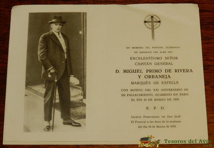 ANTIGUO RECORDATORIO DEL FALLECIMIENTO DEL CAPITAN GENERAL D. MIGUEL PRIMO DE RIVERA Y ORBANEJA, MAQUES DE ESTELLA, CON MOTIVO DEL XXI ANIVERSARIO DE SU FALLECIMIENTO, OCURRIDO EN PARIS EL DIA 16 DE MARZO DE 1930, 16 DE MARZO DE 1951, ED. HAUSER Y MENET,
