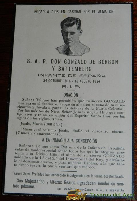 ANTIGUO RECORDATORIO DEL FALLECIMIENTO DE S.A.R. DON GONZALO DE BORBON Y BATTENBERG INFANTE DE ESPAÑA, ED. CATOLICA GUIPUZCOA, MIDE 12 CM X 7,5 CM.