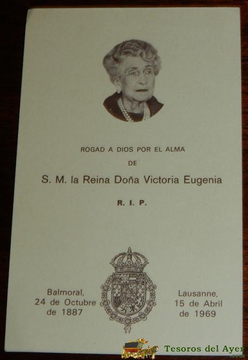 ANTIGUO RECORDATORIO DE S.M. LA REINA DOÑA VICTORIA EUGENIA, FALLECIDA EN LAUSANNE EL 15 DE ABRIL DE 1969, MIDE 12 X 7,5 CMS.