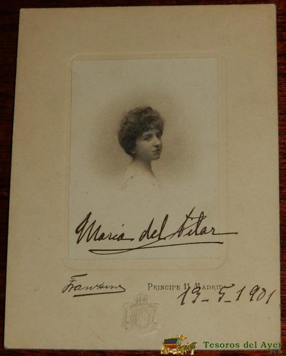 ANTIGUA FOTOGRAFIA ALBUMINA DE ARISTOCRATA ESPAÑOLA, DONA MARIA DEL PILAR, REALIZADA POR FRANZEN EN 1901, CON FIRMA MANUSCRITA, MIDE 11,8 X 8,7 CMS..