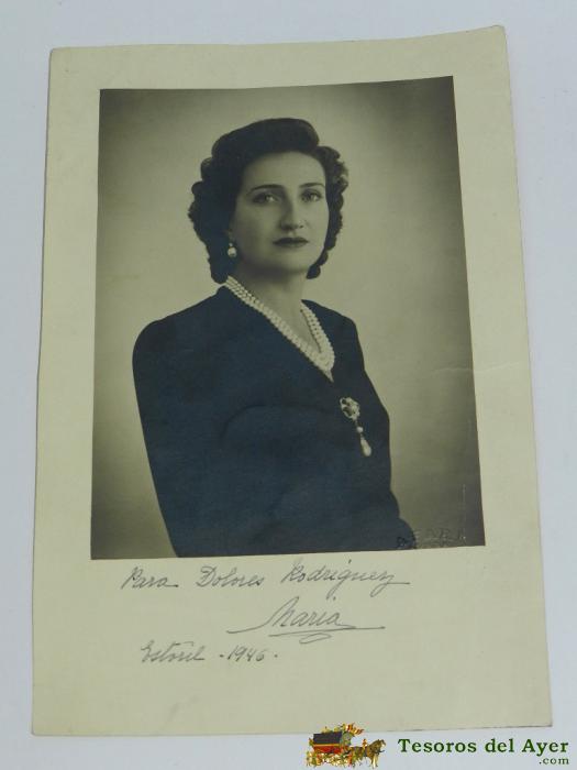 ANTIGUA FOTOGRAFIA DE MARíA DE LAS MERCEDES, MADRE DEL REY DON JUAN CARLOS, CON DEDICATORIA Y FIRMA MANUSCRITA DURANTE EL EXILIO EN ESTORIL EN 1946, MIDE 22,5 X 14,7 CMS. FOTO AFARI, LISBOA.