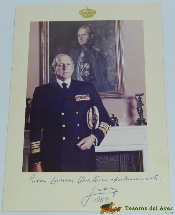 ANTIGUA FOTOGRAFIA DE JUAN DE BORBóN Y BATTENBERG, HIJO DE ALFONSO XIII Y PADRE DEL REY DON JUAN CARLOS, CON DEDICATORIA Y FIRMA MANUSCRITA, AñO 1984, MIDE 24,3 X 17 CMS.
