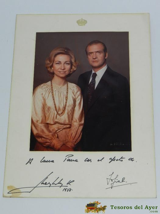 ANTIGUA FOTOGRAFIA DEL REY DON JUAN CARLOS Y DOÑA SOFIA, CON DEDICATORIA Y FIRMAS MANUSCRITAS, AÑO 1988, MONARQUIA, FOTO A. SCHOMMER, MIDE 27 X 19,5 CMS.