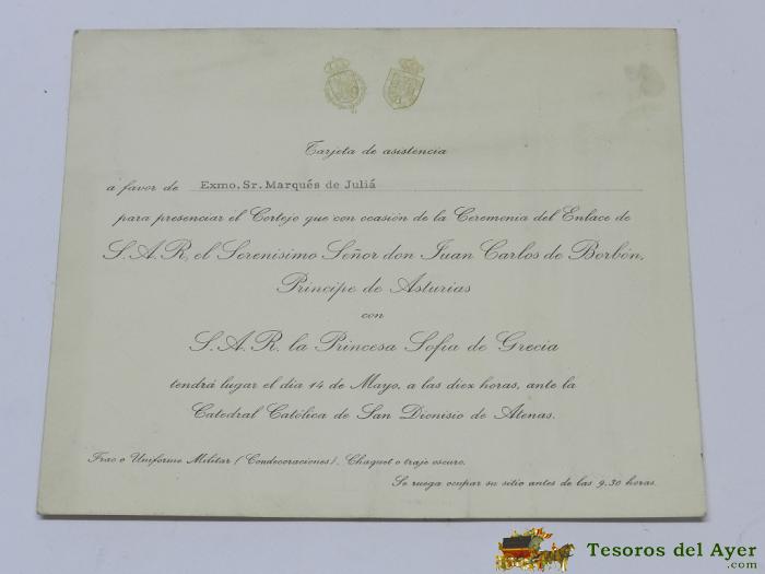 TARJETON DE INVITACION ORIGINAL DE ASISTENCIA PARA LA BODA DE JUAN CARLOS DE BORBON Y LA PRINCESA SOFIA DE GRECIA EL DIA 14 DE MAYO DE 1962 EN LA CATEDRAL CATOLICA DE SAN DIONISIODE ATENAS. MIDE 20,5 X 16,5 CMS.