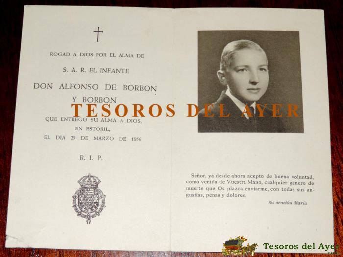 ANTIGUO RECORDATORIO FALLECIMIENTO DE EL INFANTE DON ALFONSO DE BORBON Y BORBON, QUE ESTREGO SU ALMA A DIOS, EN ESTORIL, EL DIA 29 DE MARZO DE 1956, MURIO POR EL ACCIDENTE CON UN REVOLVER, MIENTRAS JUGABA CON SU HERMANO EL REY JUAN CARLOS - MIDE DESPLEGAD