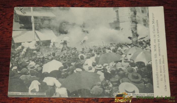 ANTIGUA POSTAL DE ATENTADO CONTRA SS.MM. EN LA CALLE MAYOR, EL 31 DE MAYO DE 1906, MOMENTO DE LA EXPLOSION, CLICHE CATERINA LEFEVRE MINARDI, NO CIRCULADA.