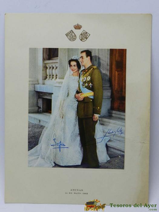 ANTIGUA FOTOGRAFIA DE LA BODA DE LOS REYES DON JUAN CARLOS Y DOÑA SOFIA, ATENAS 14 DE MAYO DE 1962, CON FIRMAS MANUSCRITAS, MONARQUIA, MIDE 22,5 X 16,5 CMS.