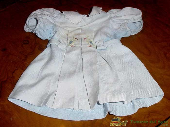 VESTIDO DE VIYELA DE LA MUÑECA GISELA, TIENE BORDADO EN PUNTO DE CRUZ, UNOS POLLITOS , ESTÁ EN BUEN ESTADO. HA PERDIDO UN POCO LA TONALIDAD AZUL, POR EL PASO DEL TIEMPO.