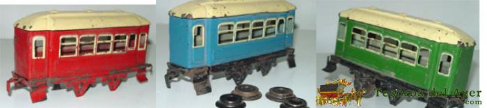 ANTIGUO LOTE DE 3 VAGONES DE TREN ESCALA 0 DE PASAJEROS DE RICO - MIDEN 16 CMS. APROXIMADAMENTE CADA UNO, NO TIENEN RUEDAS, LO QUE ES FACILMENTE SUBSANABLE.