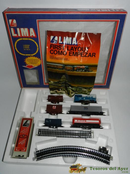 ANTIGUO TREN ELECTRICO ESCALA HO, A BATERIAS DE LIMA, CON LOCOMOTORA, 5 VAGONES, VIAS, ETC. EN SU CAJA ORIGINAL NUEVO DE ALMACEN, NUNCA JUGADO. TAL COMO SE VE EN LAS FOTOS PUESTAS.