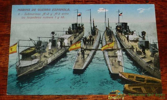 POSTAL DE MARINA DE GUERRA ESPAÑOLA, N. 6, SUBMARINOS A-2 Y A-3, ENTRE LOS TORPEDEROS NUMERO 1 Y 18, SERIE STANDARD, NO CIRCULADA.