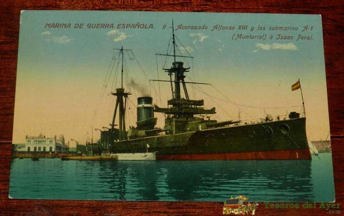 POSTAL DE MARINA DE GUERRA ESPAÑOLA, N. 9, ACORAZADO ALFONSO XIII Y LOS SUBMARINOS A-1 MUNTORIOL E ISAAC PERAL, SERIE STANDARD, NO CIRCULADA.