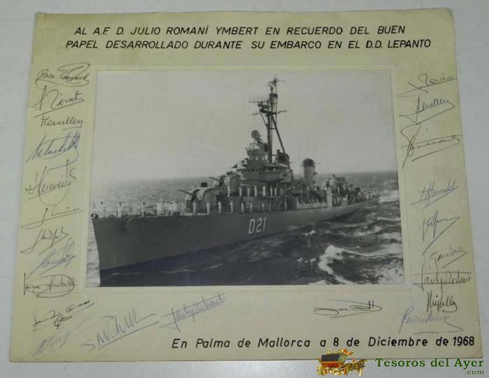 ANTIGUA FOTOGRAFIA DEL BARCO O BUQUE D.D. LEPANTO D 21, CON FIRMAS MANUSCRITAS DE LOS COMPAÑEROS DE A.F. DON JULIO ROMANI YMBERT EN RECUERDO DE SU EMBARCO, PALMA DE MALLORCA 8 DE DICIEMBRE DE 1968, MIDE INCLUIDO EL PASPARTOUT 31,5 X 26 CMS.