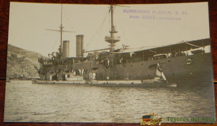 ANTIGUA FOTO POSTAL DE SUBMARINO ALEMAN U. 35, FOTO CASAU, AL LADO DE UN DESTRUCTOR, EN CARTAGENA BASE NAVAL, ESCRITA