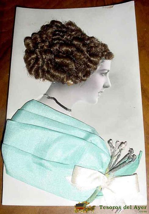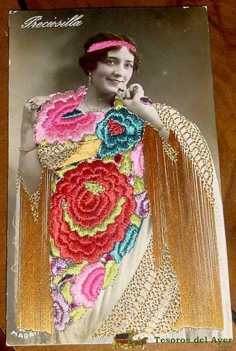 ANTIGUA FOTO POSTAL BORDADA A MANO DE PRECIOSILLA CON MANTON DE MANILA, IMPRESIONANTE - ESCRITA EN 1917