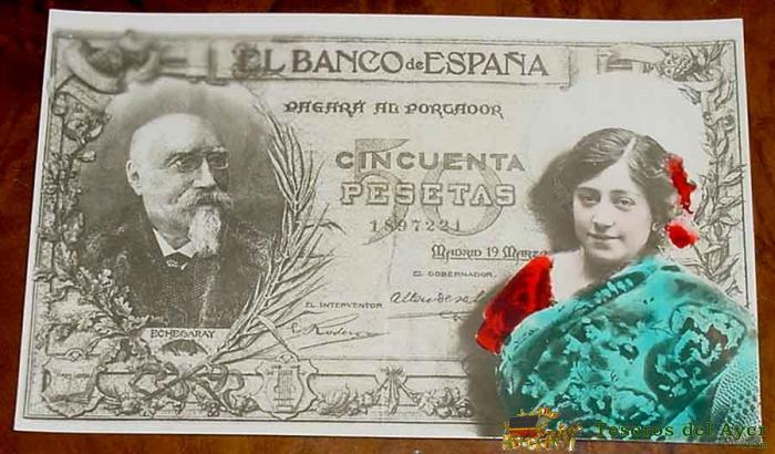 TARJETA POSTAL CON COLLAGE DE BILLETE DE CINCUENTA PESETAS. SIN CIRCULAR